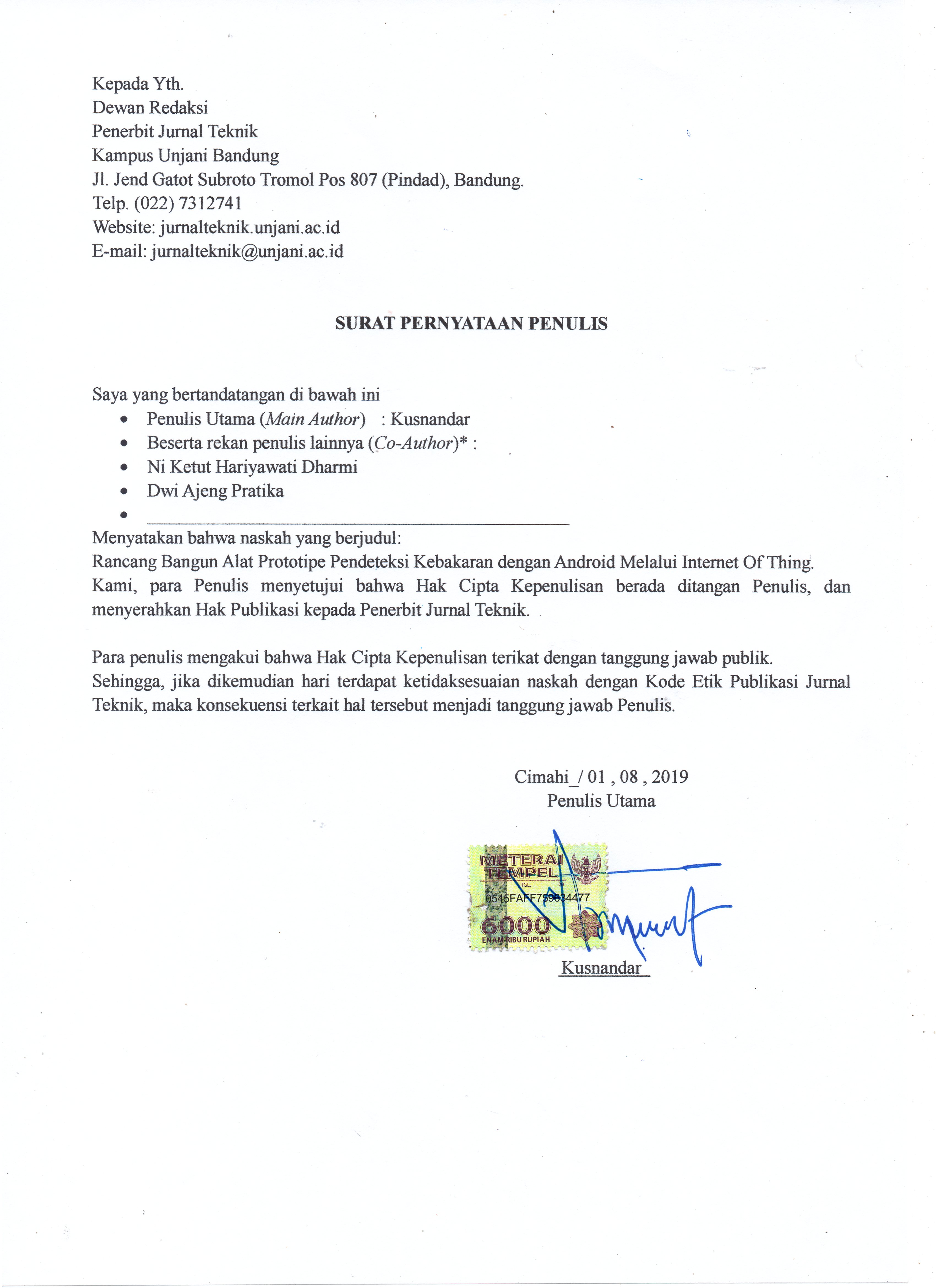 dengan pengakuan kepengarangan karya dan publikasi pertama artikel tersebut di Jurnal Teknik: Media Pengembangan dan
